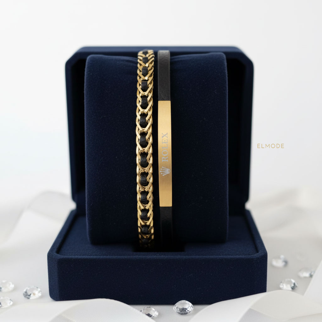 دستبند چرمی دولاین مردانه رولکس مدل ELM8290 رنگ مشکی و طلایی