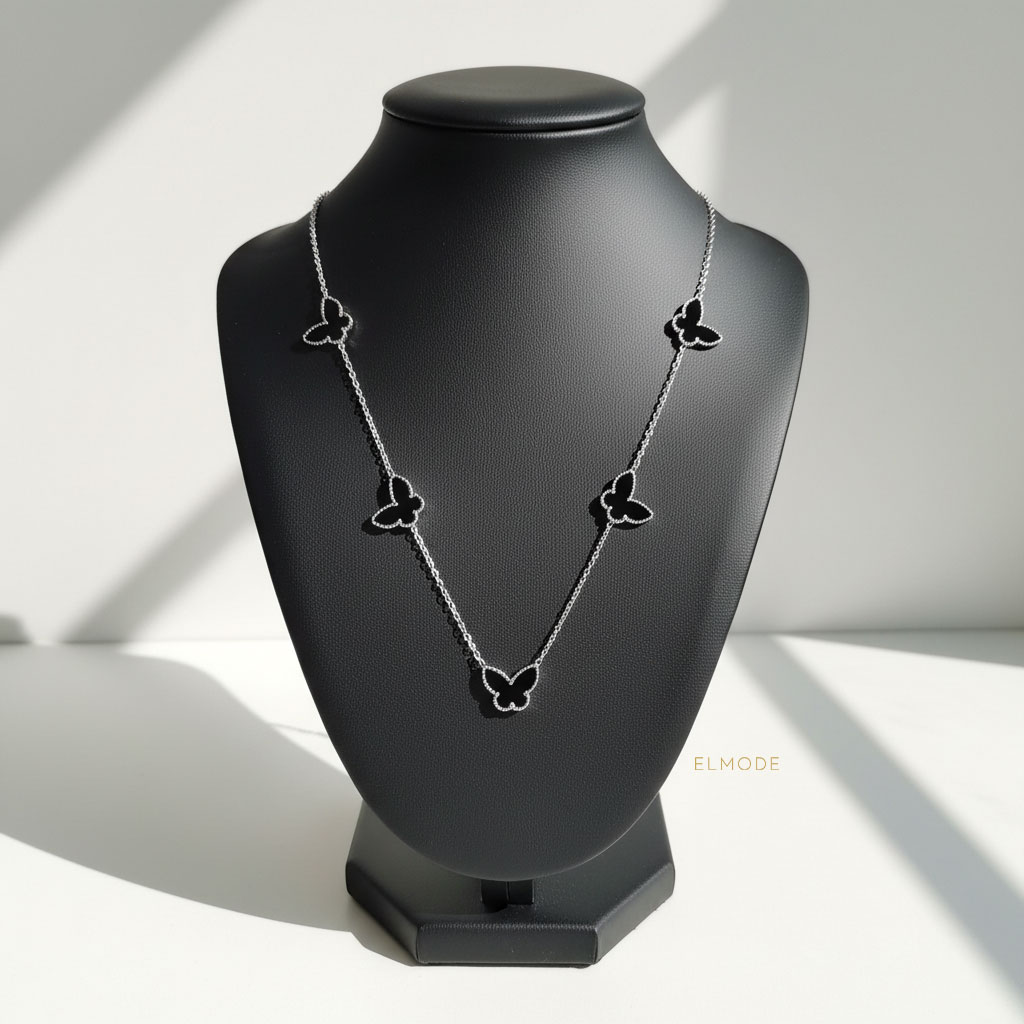 طراحی پروانه در مرکز گردنبند، جلوهای خاص به استایل زنانه شما میبخشد و مناسب استفاده روزمره یا مراسم خاص است.
